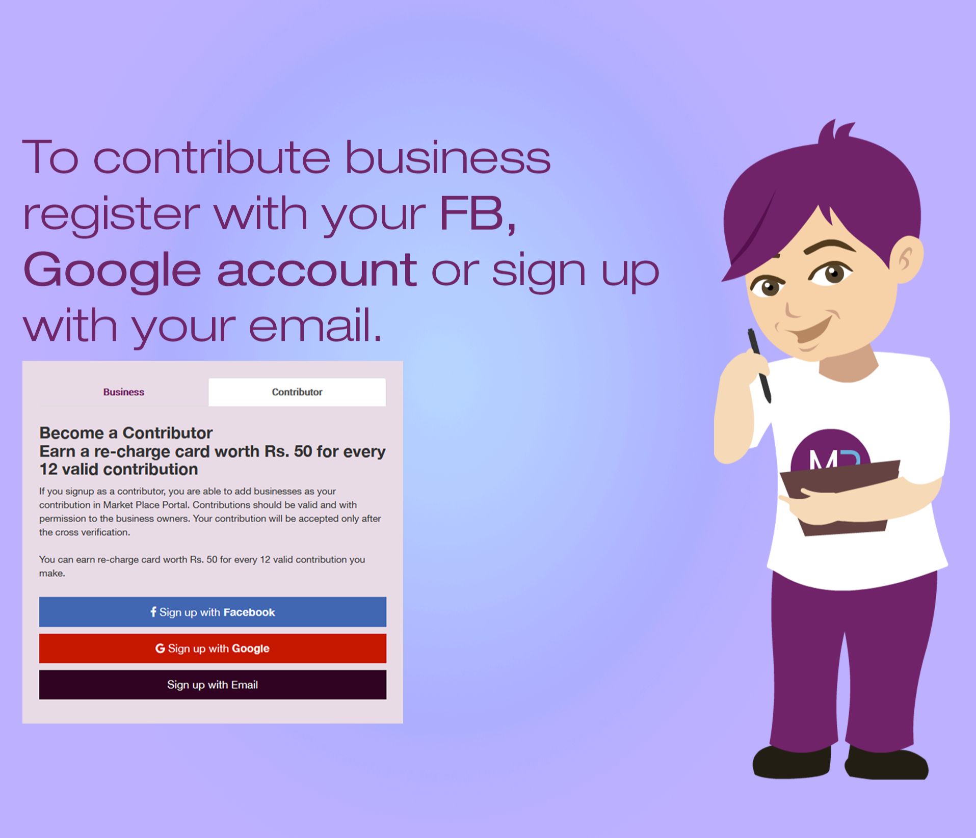 Become a Contributor Earn a re-charge card worth Rs. 50 for every 12 valid contribution