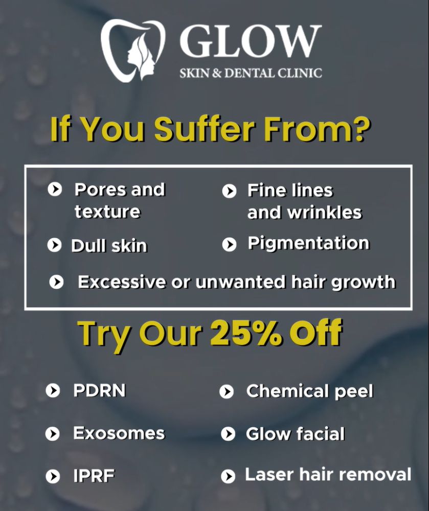 Say goodbye to dull skin, wrinkles, pigmentation, and unwanted hair. At Glow Skin & Dental Clinic, get 25% OFF on premium treatments like PDRN, IPRF, Exosomes, Chemical Peel, Glow Facial & Laser Hair Removal. Reveal flawless, glowing skin with expert care.